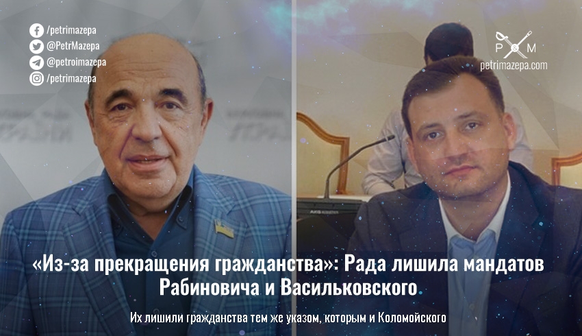 Сегодня Верховная Рада поддержала досрочное прекращение полномочий депутатов Вадима Рабиновича из ОПЗЖ и Игоря Васильковского из Слуги народа в связи с лишением гражданства Украины.