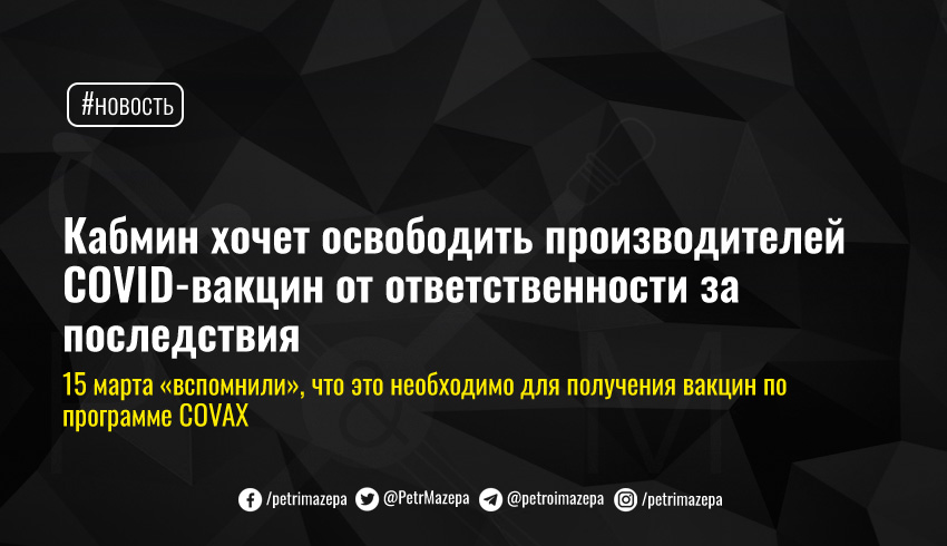 Кабмин предлагает освободить производителей вакцины против коронавируса от ответственности за любые последствия прививок. В правительстве аргументируют это тем, что норма необходима для получения вакцины в рамках COVAX (хотя сначала ждали поставки по этой инициативе еще в феврале и такого законопроекта не подавали). Речь идет о вакцинах, которые получили разрешение на экстренное использование (EUA). Но других у нас пока и нет.