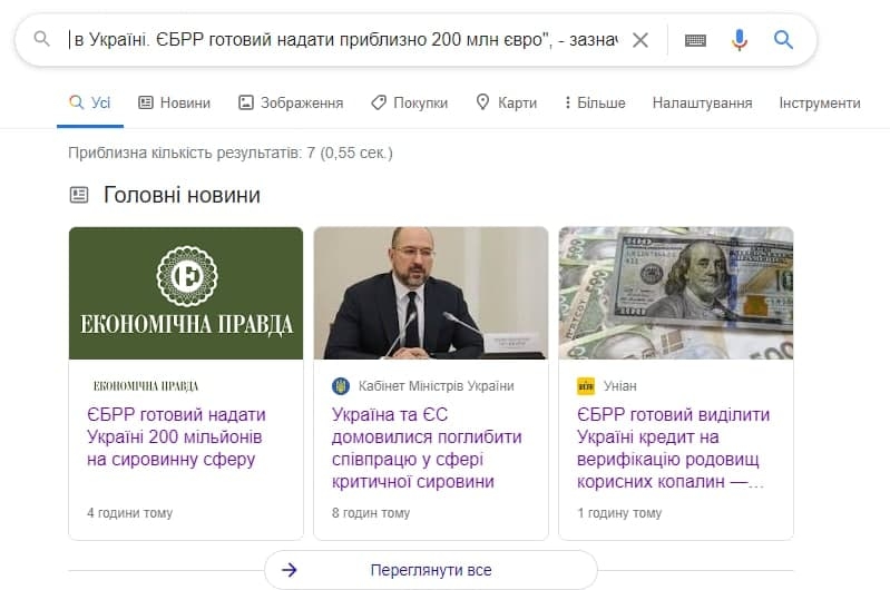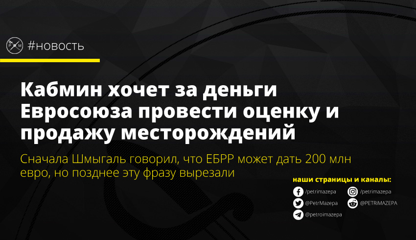 Ранее там еще была прямая речь Шмыгаля: «Мы предварительно разговаривали с ЕБРР о возможном проект верификации запасов месторождений полезных ископаемых в Украине. ЕБРР готов предоставить примерно 200 млн евро». Но затем из официальной версии ее удалили. Хотя по поиску через эту фразу новость все еще находится.