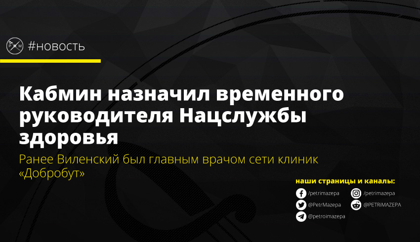 «Кабмин принял решение о временном возложении исполнения обязанностей главы Национальной службы здоровья Украины на Виленского А. Б. (директор департамента договорной работы указанной службы)», – написал представитель правительства в Верховной Раде Василий Мокан в Telegram.