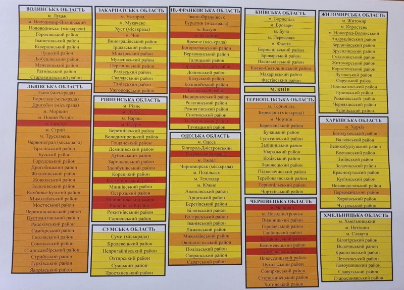 Что касается крупных городов: Львов, Харьков, Ужгород и Тернополь будут отнесены к оранжевой зоне, а Киев, Луцк, Житомир, Одесса, Ровно, Сумы и Хмельницкий - к желтой.