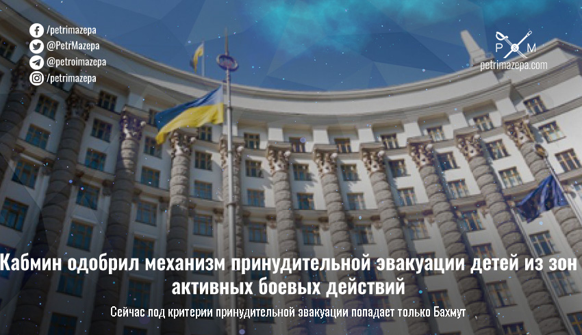 Кабинет министров утвердил механизм принудительной эвакуации детей из зон активных боевых действий. Это решение было инициировано и разработано Координационным штабом по обязательной эвакуации населения. Сейчас под соответствующие критерии попадает только Бахмут для использования принудительной эвакуации детей из боевых зон.