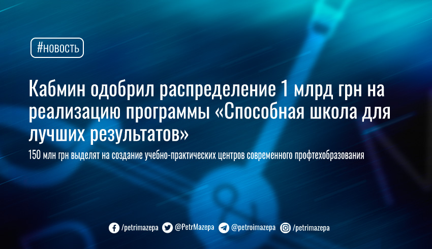 Правительство одобрило распределение 1 млрд грн на реализацию программы «Способная школа для лучших результатов». На сегодняшнем заседании Кабмина также было принято решения увеличить стипендии для студентов и о выделении 150 млн грн субвенции на создание учебно-практических центров современного профессионально-технического образования.
