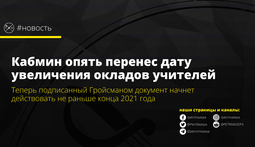 Вчера правительство, возглавляемое Денисом Шмыгалем, утвердило постановление про перенос даты начала действия постановления про увеличение должностных окладов для учителей на год - до 31 декабря 2021 года. Перенесенное постановление было подписано еще Владимиром Гройсманом в 2019 году.