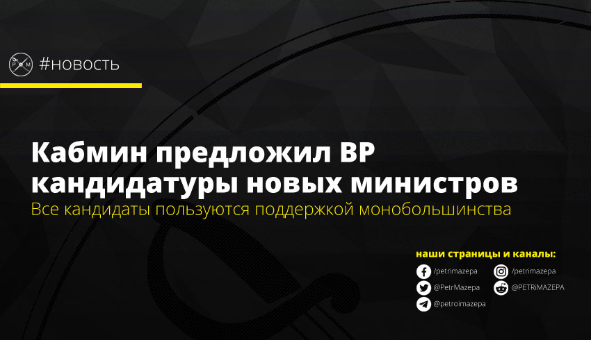 Кабинет министров внес в Верховную раду проект постановлений о назначении новых министров. Парламенту предлагается поддержать именно те кандидатуры, которые ранее были озвучены нардепами фракции «Слуга народа».
