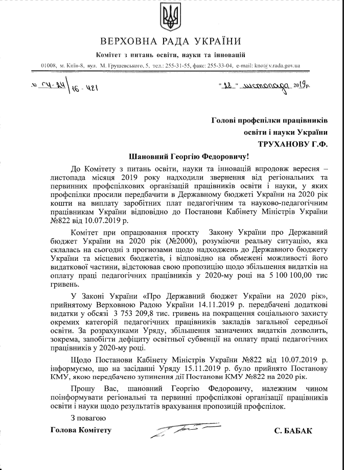 Об этом стало известно из письма председателя Комитета по вопросам образования, науки и инноваций Сергея Бабака в ответ на обращение Профсоюза работников образования и науки Украины. «Относительно Постановления Кабинета министров Украины №822 от 10.07.2019 г. информируем, что на заседании правительства 15.11.2019 г. было принято Постановление КМУ, которым предусмотрено приостановление действия Постановления КМУ №822 на 2020 год», - говорится в письме.