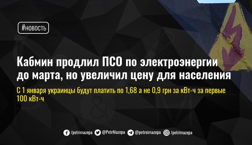 Кабинет министров Украины продлил действия ПСО (спецобязательства на рынке электроэнергии) до 31 марта 2021 года. Однако поднял стоимость электроэнергии для населения с 90 копеек за первые 100 кВт-ч до 1,68 грн за кВт-ч. Действовать изменения начнут с начала 2021 года.