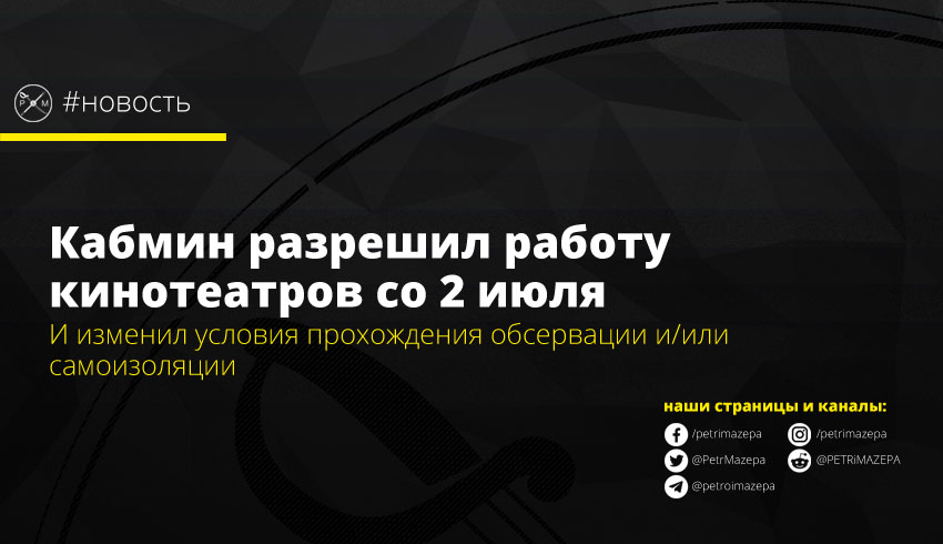 Кабинет министров внес изменения в постановление о карантинных мерах из-за COVID-19 – в частности, разрешили работу кинотеатров с 2 июля, исключили из случаев обязательной самоизоляции абитуриентов, и предусмотрели возможность прекращения самоизоляции и/или обсервации для иностранных граждан или лиц без гражданства, пересекающих границу Украины, при негативном ПЦР-тесте.