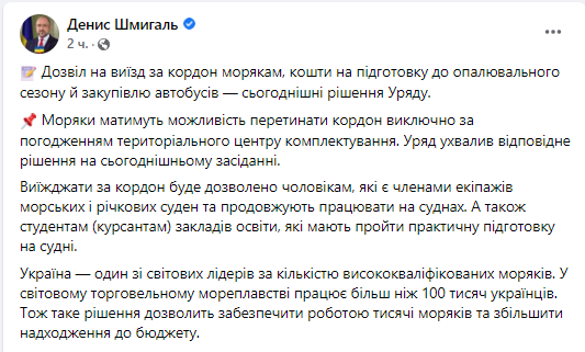 «Моряки будут иметь возможность пересекать границу исключительно по согласованию территориального центра комплектования. Правительство приняло соответствующее решение на сегодняшнем заседании», — сообщил премьер-министр Украины Денис Шмыгаль.