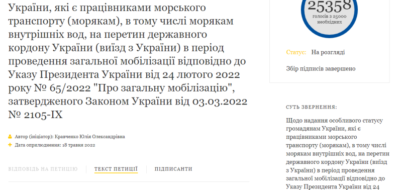 Ранее на сайте президента петиция с предложением разрешить морякам выезжать за границу во время военного положения собрала необходимое количество голосов и находится на рассмотрении. Но ответа президента на нее еще нет. Теперь и не нужно.