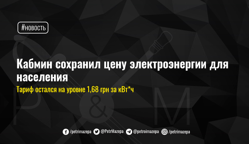 Кабинет министров решил оставить без изменений тариф на электроэнергию для населения. Цену оставили на уровне 1,68 грн за кВт*ч до 30 июня.