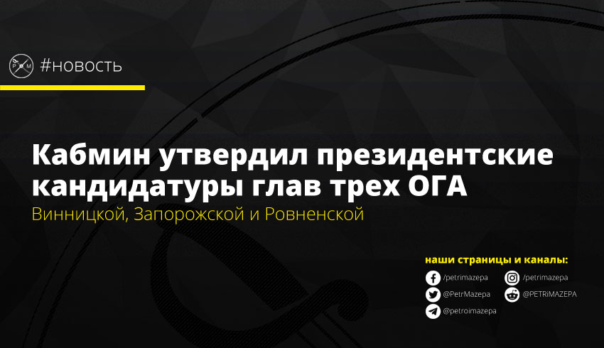 «Кабинет министров согласовал кандидатуры глав Винницкой, Запорожской и Ровненской ОГА, предложенные президентом Владимиром Зеленским», пишет LIGA.net со ссылкой на данные от представителя президента в Кабинете министров Андрея Геруса.