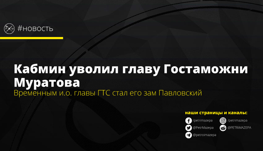 Кабинет министров сегодня принял решение освободить от исполнения обязанностей главу Государственной таможенной службы Игоря Муратова. Также правительство приняло проект распоряжения о назначении временно исполняющим обязанности главы Государственной таможенной службы на Павловского Андрея Витальевича, заместителя главы ГТС, сообщает представитель правительства в Верховной Раде Василий Мокан.