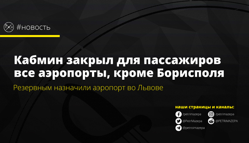 Кабинет Министров принял решение о запрете с 12:00 24 марта принимать и отправлять рейсы, которые выполняют пассажирские перевозки во всех аэропортах, кроме «Борисполя». Также запрещены полеты с туристической целью. В качестве резервного аэропорта назначили Международный аэропорт «Львов "имени Даниила Галицкого"».