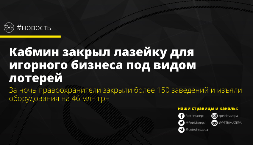 Кабинет министров закрыл лазейку, которая позволяла заниматься игорным бизнесом под видом государственных лотерей. Теперь заведения с игровыми автоматами не смогут нелегально работать под видом государственных лотерей, прикрываясь договорам препоручения на распространение государственных мгновенных лотерей.