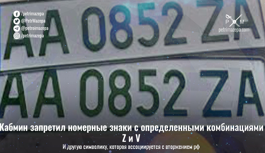 Кабинет министров запретил заказывать или производить в Украине индивидуальные номерные знаки для транспортных средств с использованием символики, связанной с полномасштабной российской войной против Украины, а также коммунистическим и нацистским тоталитарными режимами. Под запретом, в частности, оказались определенные комбинации букв Z и V.