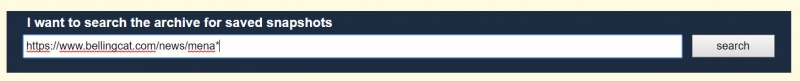 Есть более продвинутые способы поиска сохранённых страниц, если вы не знаете точную ссылку. Например, если вы хотите найти все заархивированные статьи Bellingcat с тегом MENA (Middle East North Africa, Ближний восток и Северная Африка), введите в поиск следующее: