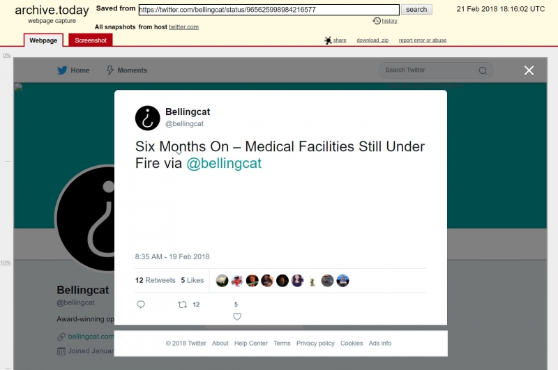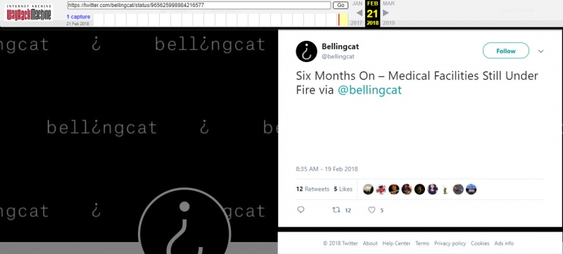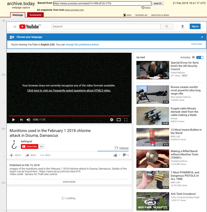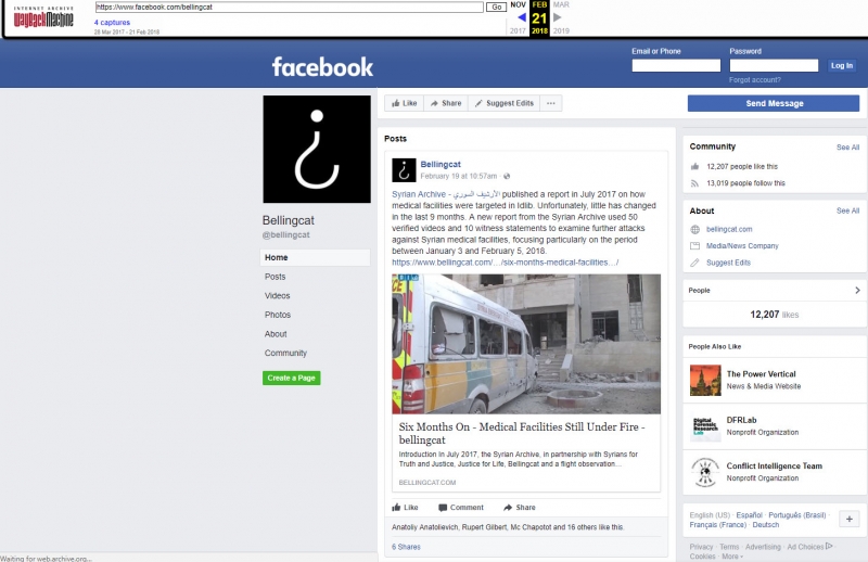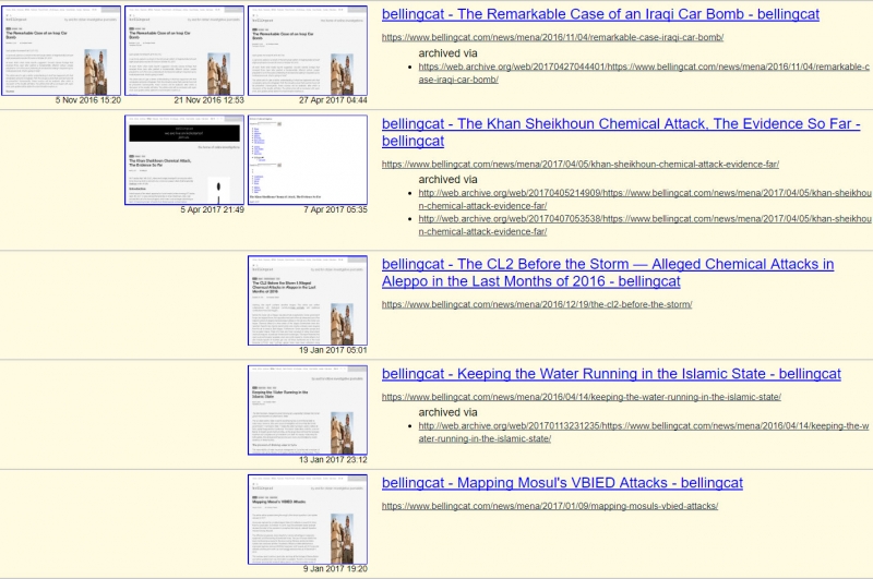 При сохранении обычных веб-страниц и новостных статей Archive.org часто даёт фору Archive.today, поскольку позволяет переходить по клику на другие заархивированные страницы. Например, с помощью Internet Archive Wayback Machine можно перемещаться по значительной части сайта Bellingcat, как будто вы в 2014 году, поскольку все эти страницы были сохранены около 4 лет назад. На Archive.today можно найти гораздо меньше заархивированных страниц.