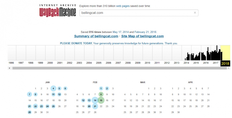 В то время как Archive.today сохраняет страницы только по запросам пользователей, Archive.org использует как запросы пользователей, так и скрипты для автоматического сохранения страниц. Например, заглавная страница Bellingcat была сфотографирована более 800 раз со дня покупки домена в мае 2014 года. Наверняка лишь небольшая их часть была сохранена по запросам пользователей.