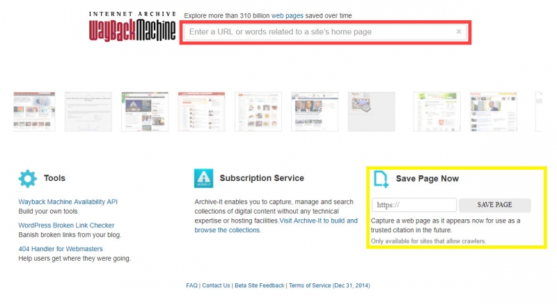 Как и в случае с Archive.today, процесс поиска и сохранения веб-страниц очень прост. Введите ссылку в строку поиска вверху страницы, чтобы посмотреть архивные версии. Чтобы сохранить страницу по ссылке, введите её справа внизу.