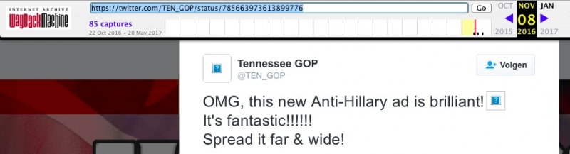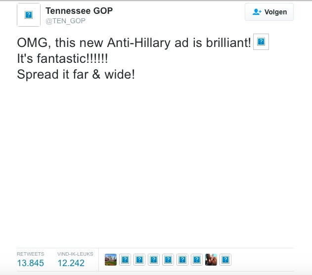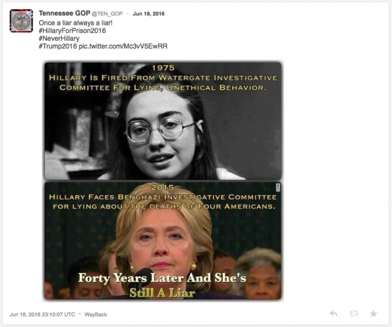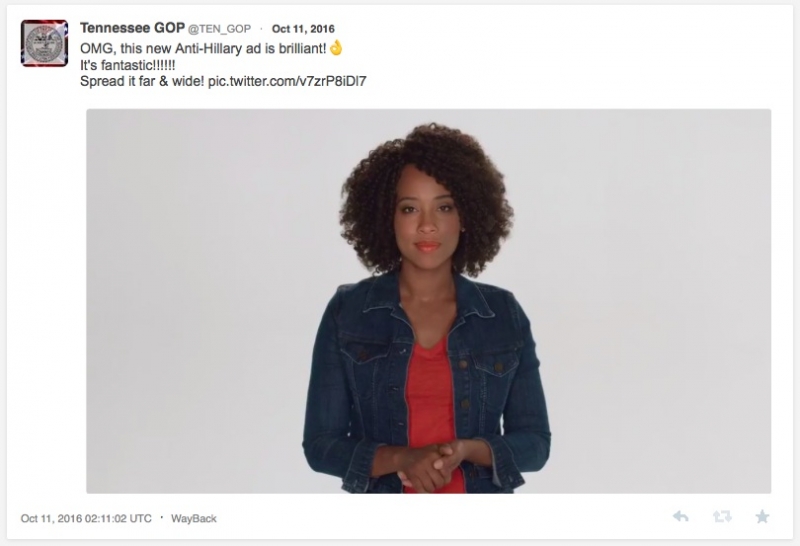 Это ссылка на вышеупомянутый твит, в котором @TEN_GOP поделился антиклинтоновской рекламой.