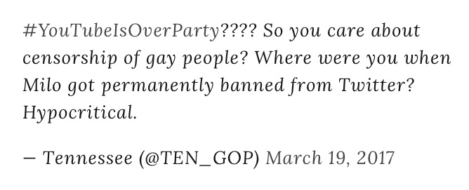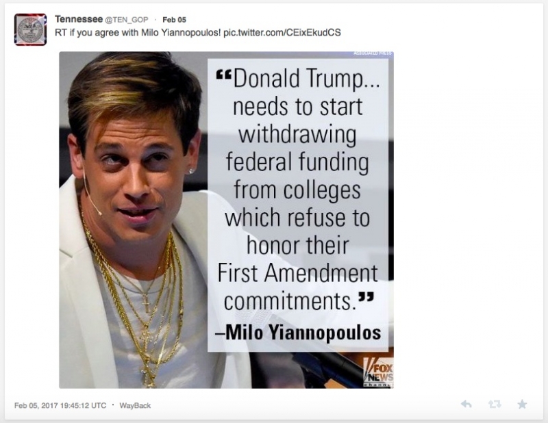 Например, @TEN_GOP выступал в поддержку Майло Яннопулоса, которого навсегда забанили в Twitter, как сообщается, за целенаправленное преследование.