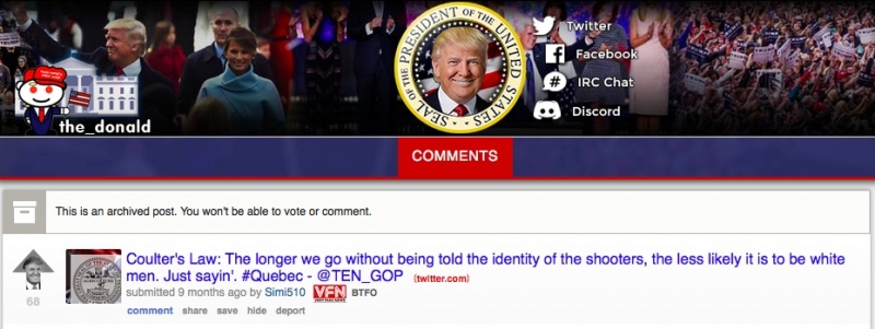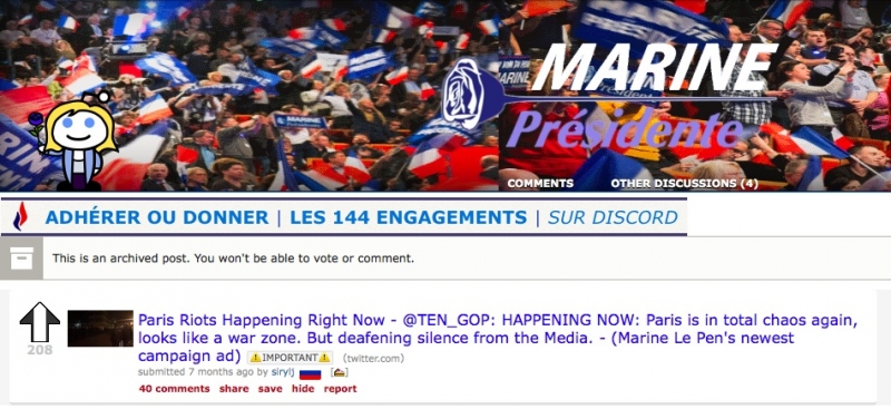 В свою очередь, этот твит был опубликован на ультраправом сабреддите, посвящённом Ле Пен (как ранее демонстрировала @DFRLab, эта группа тесно связана с американскими ультраправыми).