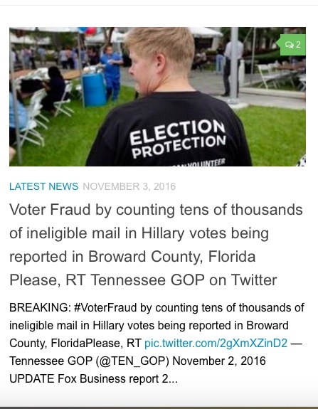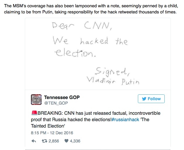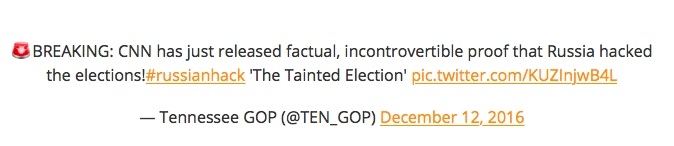 Через неделю после выборов @TEN_GOP обвинил сторонников Клинтон в фальсификациях. Эти обвинения активно педалировались Кремлём в течение нескольких месяцев до выборов.