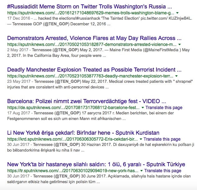 Кремлёвские пропагандистские СМИ также неоднократно распространяли сообщения @TEN_GOP: Например, «Спутник», официальная миссия которого — «сообщать о государственной политике Российской Федерации за рубежом», цитировал этот аккаунт в статьях на разных языках.