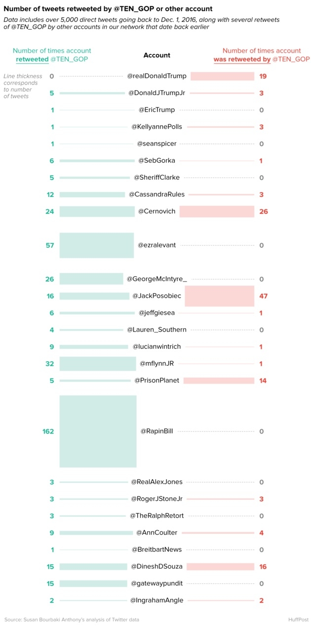 @TEN_GOP ретвитили и сын Трампа Дональд Дж. Трамп-младший, руководительница кампании Трампа Келлиэнн Конуэй и диджитал-менеджер кампании Брэд Парскейл. Подробный анализ, проведённый Люком О’Брайаном для The Huffington Post, позволил выявить масштаб взаимодействий аккаунта с ключевыми сторонниками Трампа.