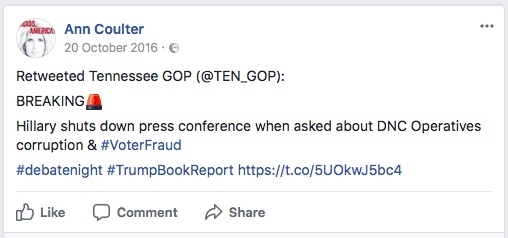 @TEN_GOP также распространял сообщения сторонницы Трампа Энн Култер, иногда при этом отмечая её в постах, чтобы уведомить её о поддержке. Согласно архиву PropOrNot, @TEN_GOP ретвитил или упоминал Култер 25 раз с декабря 2016-го по август 2017 года. Некоторые посты сохранились в сети.
