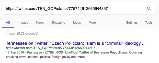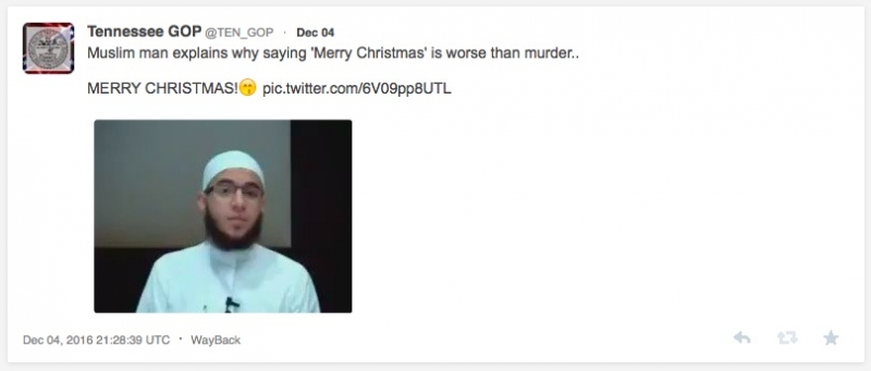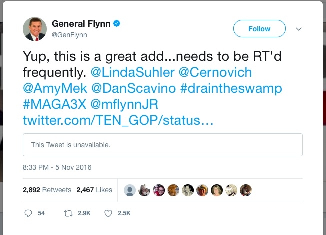 Твит, который процитировал Флинн, был удалён, но от него осталась ссылка: https://twitter.com/TEN_GOP/status/785663973613899776.