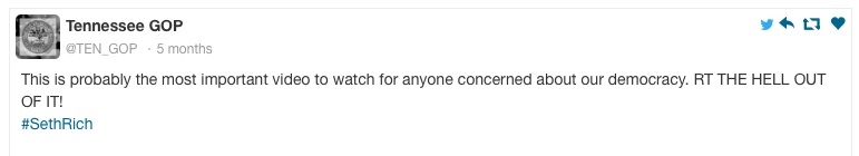 Кроме того, он распространял теорию заговора, что бывший сотрудник аппарата Демократической партии Сет Рич был убит сторонниками Клинтон.
