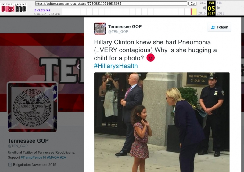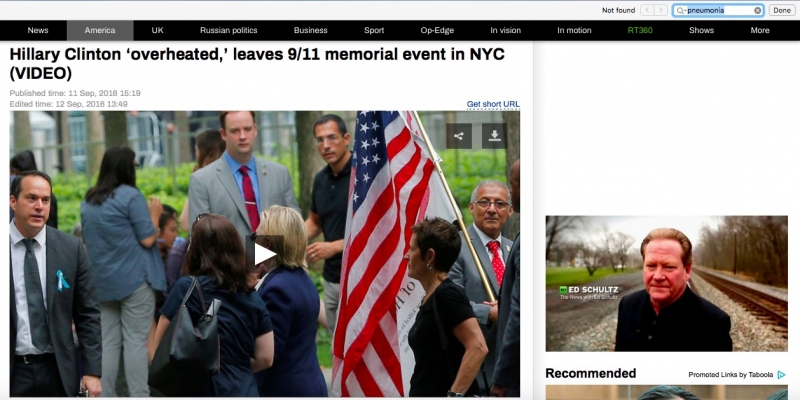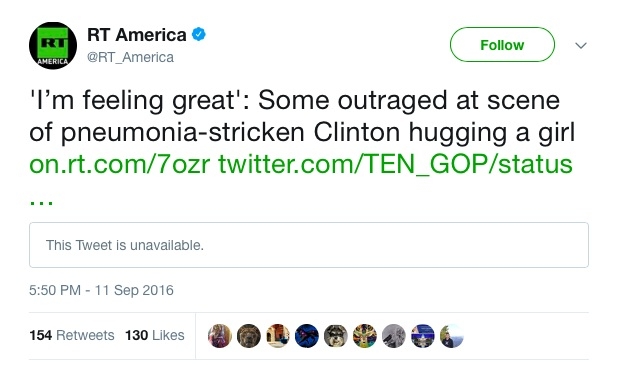 RT America, американская редакция кремлёвского телеканала, даже цитировала твит @TEN_GOP вместе со ссылкой на статью о здоровье Клинтон. В твите РТ говорится, что «некоторые возмущены», что «страдающая пневмонией» кандидатка «обнимала» девочку.