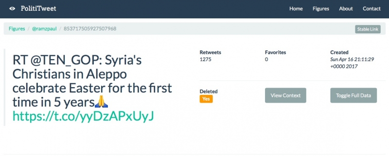 Аккаунт также восхвалял совместную российско-сирийскую осаду Алеппо и её последствия. Как ранее сообщали @DFRLab и многие другие исследователи, в ходе осады погибло множество мирных жителей, а также, по-видимому, совершались военные преступления. Согласно архиву PropOrNot, @TEN_GOP неоднократно возвращался к этой теме.