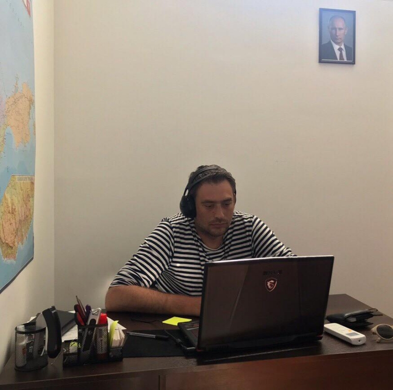 У Дегтярёва есть свой офис, как и у любого важного пропагандиста, естественно с портретом Вождя за спиной.