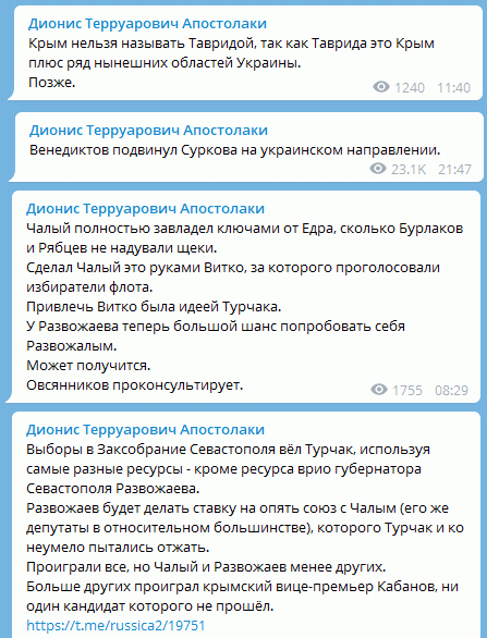 Леонид Дегтярёв никогда не скрывал, что работает на власть. Например, его уличили в авторстве анонимного телеграм-канала под названием «Дионис Терруарович Апостолаки», который работает в интересах нынешней администрации Крыма во главе с Сергеем Аксёновым, однако сам Дегтярёв это отрицал, хотя и признался, что состоит с авторами этого канала в общем чате, где они обсуждают «происходящее в медиасфере». Сам этот телеграм-канал ничем не примечателен, он ничем не отличается от ещё полусотни других кремлёвских каналов, авторы которых якобы пишут о внутренней кухне российских властей под видом независимых источников, в реальности же публикуют офисные сплетни и занимаются взаимным пиаром для наращивания аудитории.