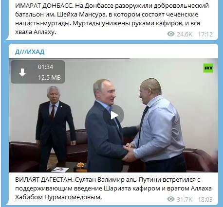 Но не только у МВД и ФСБ существуют свои неофициальные каналы в Telegram. Есть куда более интересные PR-проекты. Один из самых старых и известных в интернете — Д///ИХАД. Из названия нетрудно догадаться, что канал имеет отношение к исламской тематике. Оцените уровень юмора из описания «Совместный проект Кавказ-центра и Телеканала Дождь».