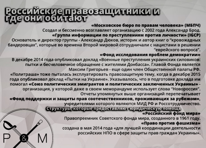 Совсем другая ситуация с русскими и «украинскими эмигрантскими» правозащитными организациями, находящимися в России. Они очень продуктивны в производстве гибридной аналитики по нарушению прав человека на Донбассе и политических репрессиях со стороны украинского режима.