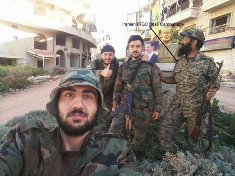 В этом примере с группой сторонников сирийских властей боец справа одет в камуфляж, отличный от камуфляжа других бойцов. Его форму можно легко определить с помощью Camopedia — открытой базы данных рисунков камуфляжа со всего мира. Воспользовавшись этой базой данных, можно установить, что форма бойца в целом совпадает с формой басиджей иранского Корпуса стражей исламской революции (КСИР). Это может указывать на то, что этот боец как-то связан с КСИР.