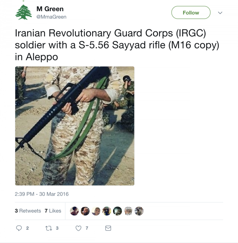 В примере в твите выше присутствие автомата «Сейяд 5.56» (иранской копии китайской «Norinco CQ») говорит о том, что боец связан с Ираном. Важно отметить, что идентификация принадлежности комбатантов по стрелковому оружию — не стопроцентный метод, особенно учитывая распространение различного стрелкового оружия на Ближнем Востоке. В идеале принадлежность комбатанта можно определить по сочетанию различных свидетельств, таких как форма, знаки различия и стрелковое оружие. Чтобы определить стрелковое оружие, можно использовать ресурс «Weapon ID database», где доступен поиск стрелкового оружия по калибру, типу, месту производства и т.п.