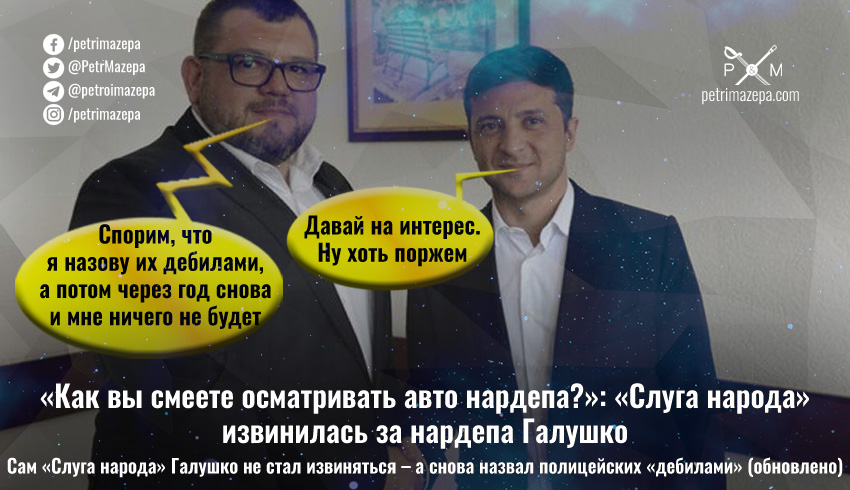 Фракция «Слуга народа» извинилась за поведение народного депутата Галушко, прославившегося сегодня благодаря видео с оскорблениями в адрес патрульных и требованием не обыскивать машину народного депутата. Сам Галушко, признавший аутентичность видео, теперь обвинил в шантаже бывшего министра внутренних дел Арсена Авакова, а его обнародование – местью за голосование за его отставку.