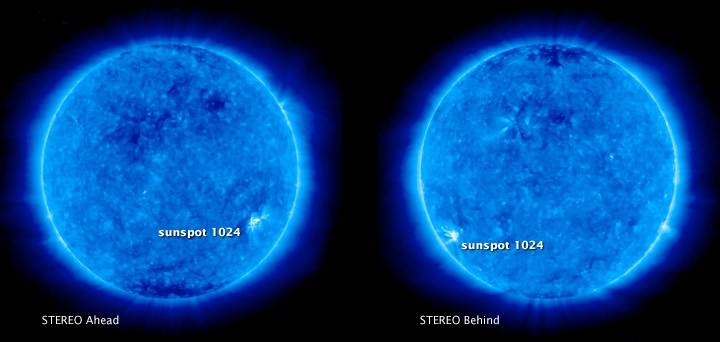 5 июля 2009 года два аппарата Двойной солнечной обсерватории (STEREO) на пути к точкам L4 и L5 сделали эти снимки солнечного пятна 1024. Виды Солнца в 60 градусов позади (на изображении — слева) и впереди (справа) от орбиты Земли показывают области поверхности Солнца, которые иначе были бы скрыты от зрения. Credit: NASA/STEREO