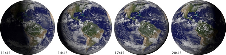 Пока спутники летят наверху, Земля под ними тоже поворачивается. К тому времени, когда спутник снова перейдёт в «дневную» область, он уже будет находиться над районом, прилегающим к той области, которую он наблюдал во время прошлого оборота. В течение суток полярные орбитальные спутники успевают рассмотреть большую часть Земли дважды: один раз при дневном свете и один раз в темноте.