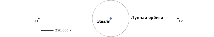 Ближайшие к Земле точки Лагранжа находятся примерно в 5 раз дальше, чем Луна. L1 находится между Солнцем и Землёй и всегда обращена к дневной стороне Земли. L2 находится напротив солнца, всегда на ночной стороне. Credit: NASA/Robert Simmon