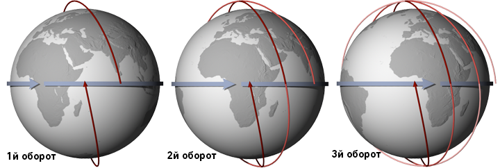Аппараты на солнечной синхронной орбите пересекают экватор примерно в одно и то же местное время каждый день (и ночь). Эта орбита позволяет проводить последовательные научные наблюдения, при этом угол между Солнцем и поверхностью Земли остаётся относительно постоянным. На этих иллюстрациях показаны 3 последовательные оборота солнечно-синхронного спутника с экваториальным временем пересечения 13:30. Последняя орбита спутника обозначена темно-красной линией, а предыдущие — более светлыми. Credit: NASA/Robert Simmon