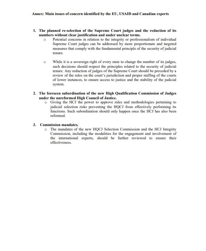 Среди представленных вопросов – запланированный повторный отбор судей Верховного Суда и сокращение их численности без четкой процедуры и в непонятный срок, подчинение новой ВККС Высшему совету правосудия, который не был реформирован, и условия создания конкурсной комиссии для отбора членов ВККС и Комиссии по вопросам добросовестности и этики при ВСП.