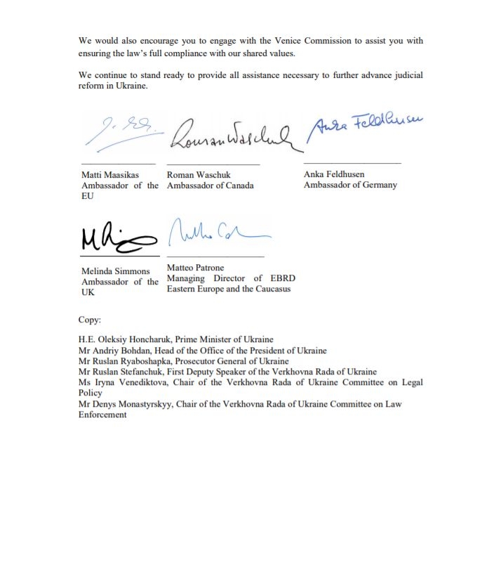 Текст письма, подписанного послом ЕС Матти Маасикасом, послом Великобритании Мелиндой Симмонс, послом Канады Романом Ващуком, гендиректором ЕБРР по Восточной Европе и Кавказу Маттео Патроне и послом Германии Анкой Фельдгузен представила «Судебно-юридическая газета». В нем указывается, что хотя авторы послания понимают, что законопроект был усовершенствован при подготовке ко второму чтению, они все еще обеспокоены соответствием некоторых элементов законопроекта касательно независимости судей, и хотели бы встретиться с президентом Зеленским, чтобы выяснить, почему некоторые из наших вопросов касательно законопроекта могут нести большие риски для реформы, и предложить альтернативные решения.