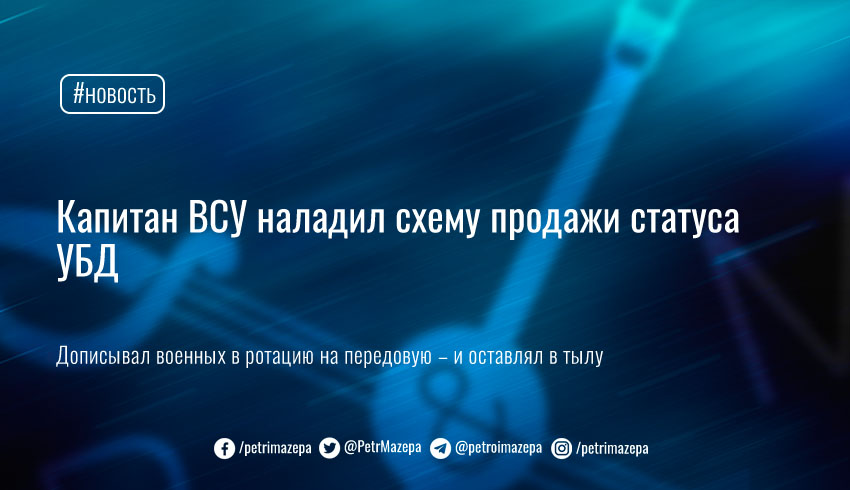 Следователи ГБР сообщили капитану ВСУ о подозрении по статье о взятке (ч. 3 ст. 368 УК Украины), по которой ему грозит до 10 лет лишения свободы. Проводятся обыски, устанавливается, сколько всего военнослужащих воспользовались «услугами» командира роты и незаконно получили статус УБД.