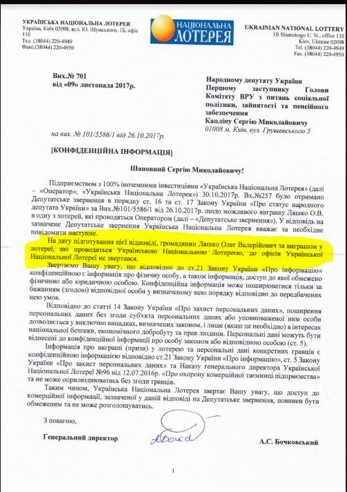 Также, по данным Каплина, НАПК займется проверкой Ляшко «только в следующем году, чтобы радикальный везунчик успел спрятать все концы в воду». Также Каплин сообщает, что повторно обратился в НАПК и пообщался с НАБУ, чтобы сообщить им новые детали для расследования. И даже показал ответ от «Украинской Национальной Лотереи».